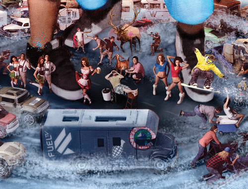 Snowboarders, snowmobilers, wakeboarders, heli-boarders, dogsledders, goat-milkers, fishing-boat-gun-shooters, trophy-truckers, RV-riders, Euro-sports-car-drivers, lederhosen-clad dudes, German-beer-maid gals, police and rescue vehicles, and any other crazy folks we could think of needed to feel welcome in this illustration.